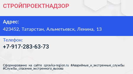 СТРОЙПРОЕКТНАДЗОР по адресу 423452, Татарстан, Альметьевск, Ленина, 13 в дальнейшем Организация, размещена в следующих категориях: