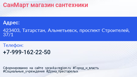 СанМарт, магазин сантехники по адресу 423403, Татарстан, Альметьевск, проспект Строителей, 37/1 в дальнейшем Организация, размещена в следующих категориях: