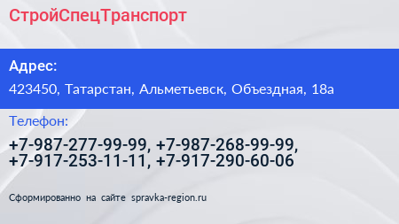 СтройСпецТранспорт по адресу 423450, Татарстан, Альметьевск, Объездная, 18а в дальнейшем Организация, размещена в следующих категориях: