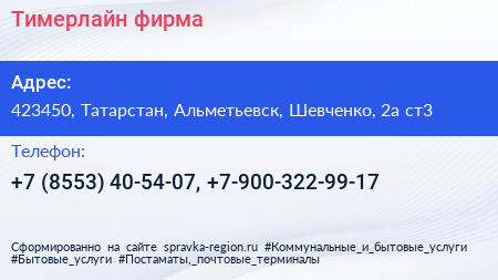 Тимерлайн, фирма по адресу 423450, Татарстан, Альметьевск, Шевченко, 2а ст3 в дальнейшем Организация, размещена в следующих категориях: