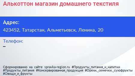 Алькоттон, магазин домашнего текстиля по адресу 423452, Татарстан, Альметьевск, Ленина, 20 в дальнейшем Организация, размещена в следующих категориях: