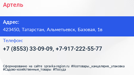 Артель по адресу 423450, Татарстан, Альметьевск, Базовая, 1в в дальнейшем Организация, размещена в следующих категориях: