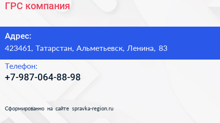 ГРС, компания по адресу 423461, Татарстан, Альметьевск, Ленина, 83 в дальнейшем Организация, размещена в следующих категориях: