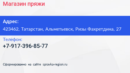 Магазин пряжи по адресу 423462, Татарстан, Альметьевск, Ризы Фахретдина, 27 в дальнейшем Организация, размещена в следующих категориях: