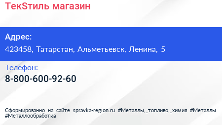 ТекSтиль, магазин по адресу 423458, Татарстан, Альметьевск, Ленина, 5 в дальнейшем Организация, размещена в следующих категориях: