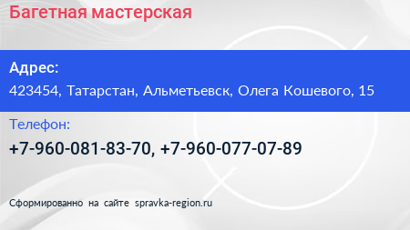 Багетная мастерская по адресу 423454, Татарстан, Альметьевск, Олега Кошевого, 15 в дальнейшем Организация, размещена в следующих категориях: