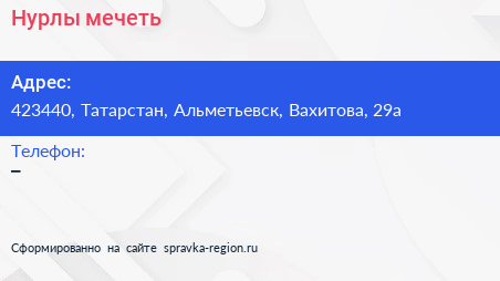 Нурлы, мечеть по адресу 423440, Татарстан, Альметьевск, Вахитова, 29а в дальнейшем Организация, размещена в следующих категориях: