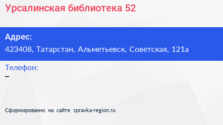 Урсалинская библиотека №52 по адресу 423408, Татарстан, Альметьевск, Советская, 121а в дальнейшем Организация, размещена в следующих категориях: