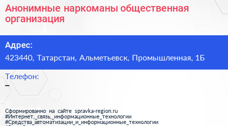 Анонимные наркоманы, общественная организация по адресу 423440, Татарстан, Альметьевск, Промышленная, 1Б в дальнейшем Организация, размещена в следующих категориях: