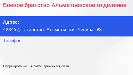 Боевое братство, Альметьевское отделение по адресу 423457, Татарстан, Альметьевск, Ленина, 98 в дальнейшем Организация, размещена в следующих категориях:
