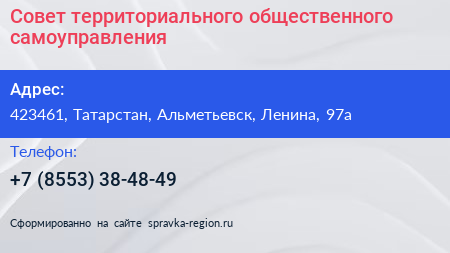 Совет территориального общественного самоуправления по адресу 423461, Татарстан, Альметьевск, Ленина, 97а в дальнейшем Организация, размещена в следующих категориях: