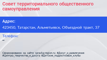 Совет территориального общественного самоуправления по адресу 423450, Татарстан, Альметьевск, Объездной тракт, 37 в дальнейшем Организация, размещена в следующих категориях: