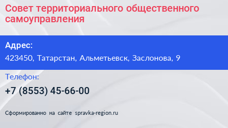 Совет территориального общественного самоуправления по адресу 423450, Татарстан, Альметьевск, Заслонова, 9 в дальнейшем Организация, размещена в следующих категориях: