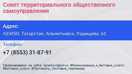 Совет территориального общественного самоуправления по адресу 423450, Татарстан, Альметьевск, Радищева, 61 в дальнейшем Организация, размещена в следующих категориях: