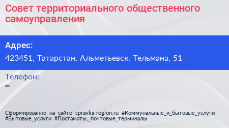 Совет территориального общественного самоуправления по адресу 423451, Татарстан, Альметьевск, Тельмана, 51 в дальнейшем Организация, размещена в следующих категориях: