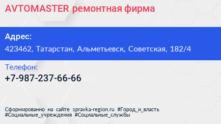 AVTOMASTER, ремонтная фирма по адресу 423462, Татарстан, Альметьевск, Советская, 182/4 в дальнейшем Организация, размещена в следующих категориях: