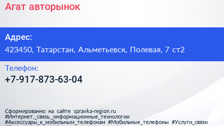 Агат, авторынок по адресу 423450, Татарстан, Альметьевск, Полевая, 7 ст2 в дальнейшем Организация, размещена в следующих категориях: