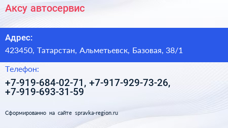 Аксу, автосервис по адресу 423450, Татарстан, Альметьевск, Базовая, 38/1 в дальнейшем Организация, размещена в следующих категориях: