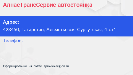 АлнасТрансСервис, автостоянка по адресу 423450, Татарстан, Альметьевск, Сургутская, 4 ст1 в дальнейшем Организация, размещена в следующих категориях: