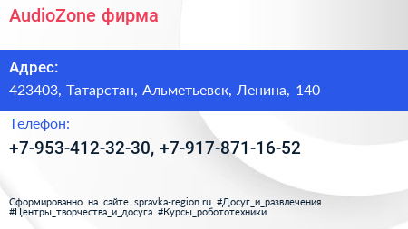 AudioZone, фирма по адресу 423403, Татарстан, Альметьевск, Ленина, 140 в дальнейшем Организация, размещена в следующих категориях: