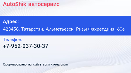 AutoShik, автосервис по адресу 423458, Татарстан, Альметьевск, Ризы Фахретдина, 60е в дальнейшем Организация, размещена в следующих категориях:
