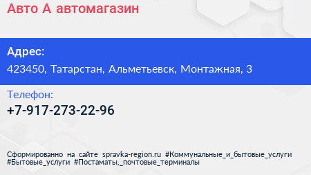 Авто-А, автомагазин по адресу 423450, Татарстан, Альметьевск, Монтажная, 3 в дальнейшем Организация, размещена в следующих категориях: