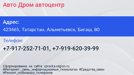 Авто Дром, автоцентр по адресу 423465, Татарстан, Альметьевск, Бигаш, 80 в дальнейшем Организация, размещена в следующих категориях: