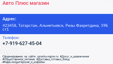 Авто Плюс, магазин по адресу 423458, Татарстан, Альметьевск, Ризы Фахретдина, 59Б ст1 в дальнейшем Организация, размещена в следующих категориях: