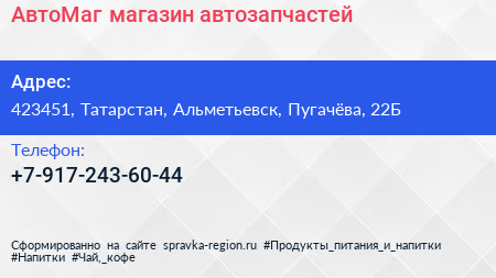 АвтоМаг, магазин автозапчастей по адресу 423451, Татарстан, Альметьевск, Пугачёва, 22Б в дальнейшем Организация, размещена в следующих категориях:
