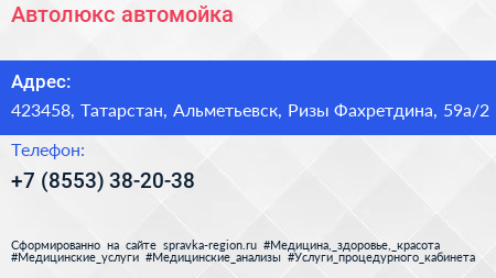 Автолюкс, автомойка по адресу 423458, Татарстан, Альметьевск, Ризы Фахретдина, 59а/2 в дальнейшем Организация, размещена в следующих категориях:
