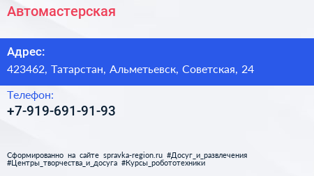 Автомастерская по адресу 423462, Татарстан, Альметьевск, Советская, 24 в дальнейшем Организация, размещена в следующих категориях: