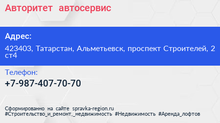 Авторитет+, автосервис по адресу 423403, Татарстан, Альметьевск, проспект Строителей, 2 ст4 в дальнейшем Организация, размещена в следующих категориях: