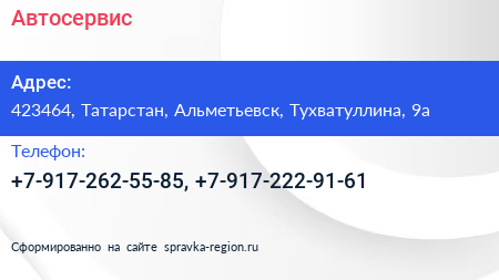 Автосервис по адресу 423464, Татарстан, Альметьевск, Тухватуллина, 9а в дальнейшем Организация, размещена в следующих категориях: