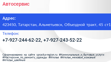 Автосервис по адресу 423450, Татарстан, Альметьевск, Объездной тракт, 45 ст1 в дальнейшем Организация, размещена в следующих категориях: