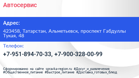 Автосервис по адресу 423458, Татарстан, Альметьевск, проспект Габдуллы Тукая, 48 в дальнейшем Организация, размещена в следующих категориях: