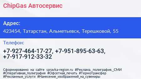 ChipGas, Автосервис по адресу 423454, Татарстан, Альметьевск, Терешковой, 55 в дальнейшем Организация, размещена в следующих категориях: