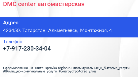 DMC-center, автомастерская по адресу 423450, Татарстан, Альметьевск, Монтажная, 4 в дальнейшем Организация, размещена в следующих категориях: