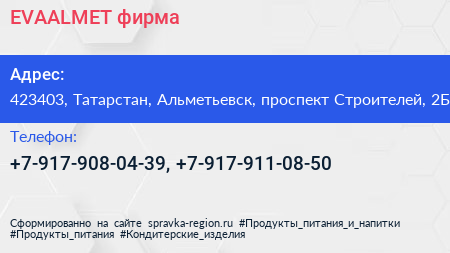 EVAALMET, фирма по адресу 423403, Татарстан, Альметьевск, проспект Строителей, 2Б в дальнейшем Организация, размещена в следующих категориях: