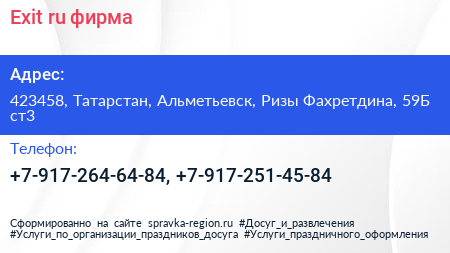 Exit.ru, фирма по адресу 423458, Татарстан, Альметьевск, Ризы Фахретдина, 59Б ст3 в дальнейшем Организация, размещена в следующих категориях: