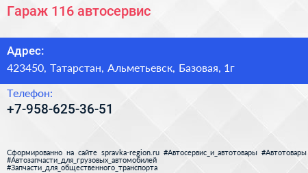 Гараж 116, автосервис по адресу 423450, Татарстан, Альметьевск, Базовая, 1г в дальнейшем Организация, размещена в следующих категориях:
