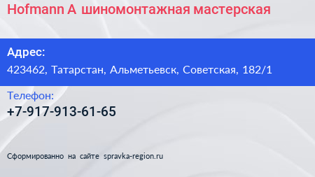 Hofmann A, шиномонтажная мастерская по адресу 423462, Татарстан, Альметьевск, Советская, 182/1 в дальнейшем Организация, размещена в следующих категориях:
