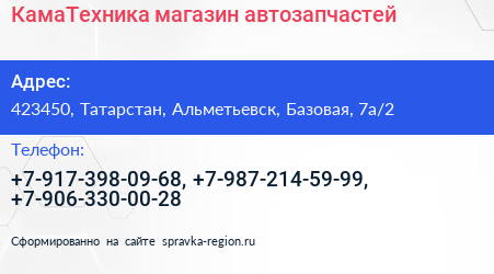 КамаТехника, магазин автозапчастей по адресу 423450, Татарстан, Альметьевск, Базовая, 7а/2 в дальнейшем Организация, размещена в следующих категориях: