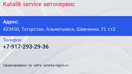 Katalik service, автосервис по адресу 423450, Татарстан, Альметьевск, Шевченко, 71 ст2 в дальнейшем Организация, размещена в следующих категориях: