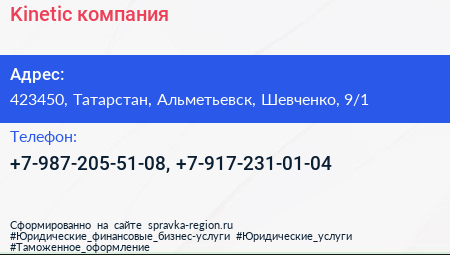 Kinetic, компания по адресу 423450, Татарстан, Альметьевск, Шевченко, 9/1 в дальнейшем Организация, размещена в следующих категориях: