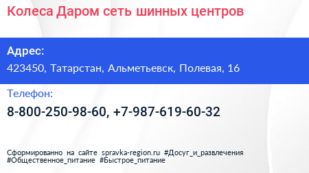 Колеса Даром, сеть шинных центров по адресу 423450, Татарстан, Альметьевск, Полевая, 16 в дальнейшем Организация, размещена в следующих категориях: