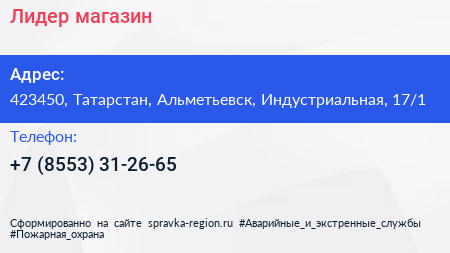 Лидер, магазин по адресу 423450, Татарстан, Альметьевск, Индустриальная, 17/1 в дальнейшем Организация, размещена в следующих категориях: