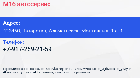 М16, автосервис по адресу 423450, Татарстан, Альметьевск, Монтажная, 1 ст1 в дальнейшем Организация, размещена в следующих категориях: