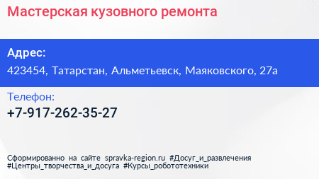 Мастерская кузовного ремонта по адресу 423454, Татарстан, Альметьевск, Маяковского, 27а в дальнейшем Организация, размещена в следующих категориях: