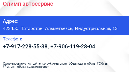 Олимп, автосервис по адресу 423450, Татарстан, Альметьевск, Индустриальная, 13 в дальнейшем Организация, размещена в следующих категориях: