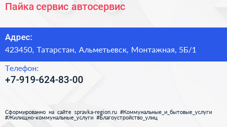 Пайка сервис, автосервис по адресу 423450, Татарстан, Альметьевск, Монтажная, 5Б/1 в дальнейшем Организация, размещена в следующих категориях:
